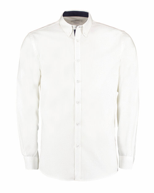 Contrast inner collar stand inner cuff and cuff placket.