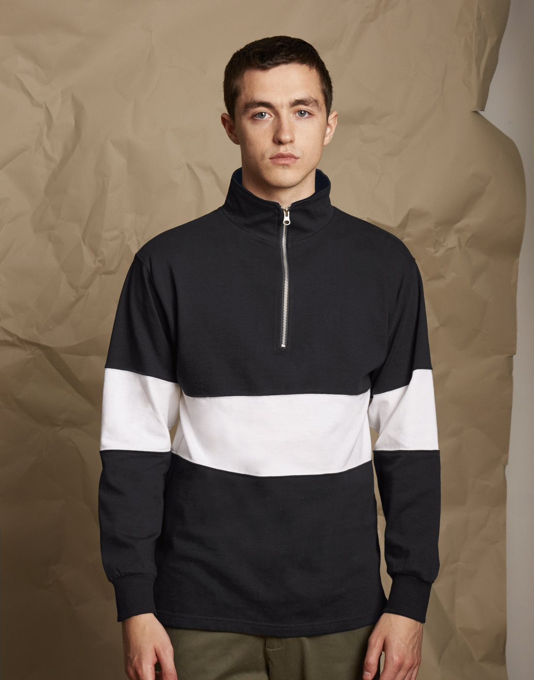 100% ringspun cotton 300gsm 34/36 36/38 38/40 42 44/46 48 Retro fit fashion 1/4 zip Heavyweight single ejersey fabric Cut and sew contrast panel around centre Self fabric funnel neck and silver YKK metal zipper and zip pull Herringbone back neck tape and contrast herringbone taped side vents and shoulders Stepped hem Elastane reinforced ribbed cuffs for shape retention